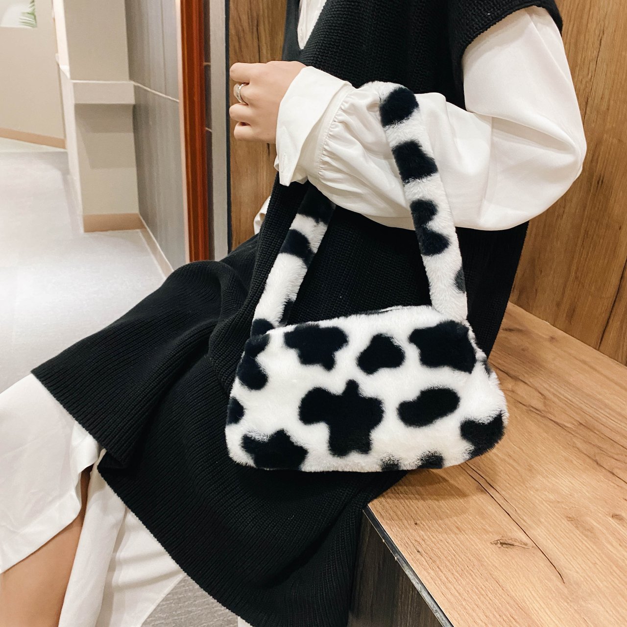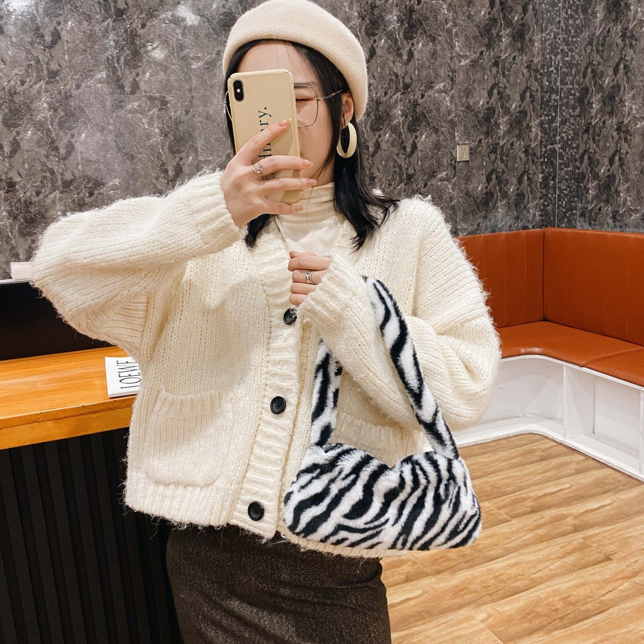 Women Small Winter Autumn Plush Stripe Leopard Streetwear Square Zipper Shoulder Bags